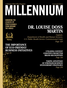 HONORING THE LEGACIES OF PROFESSIONALS FROM AROUND THE WORLD MILLENNIUM A Marquis Who’s Who Magazine Fourteenth Edition UTILIZING CONTENT CURATION FOR BETTER BRAND RECOGNITION Page 168 TAKING ADVANTAGE OF STRONGER BUSINESS SPONSORSHIP STRATEGIES Page 208 THE IMPORTANCE OF ECO-FRIENDLY BUSINESS INITIATIVES Page 80 DR. LOUISE DOSS MARTIN Captain, Department of Health and Human Services, U.S. Public Health Service Commissioned Corps Page 325