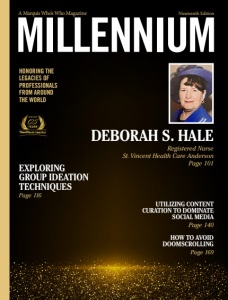 UTILIZING CONTENT CURATION TO DOMINATE SOCIAL MEDIA Page 140 HOW TO AVOID DOOMSCROLLING Page 169 MILLENNIUM EXPLORING GROUP IDEATION TECHNIQUES Page 116 HONORING THE LEGACIES OF PROFESSIONALS FROM AROUND THE WORLD A Marquis Who’s Who Magazine Nineteenth Edition DEBORAH S. HALE Registered Nurse St. Vincent Health Care Anderson Page 101