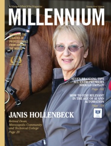JANIS HOLLENBECK Retired Dean, Minneapolis Community and Technical College Page 20 MILLENNIUM HONORING THE LEGACIES OF PROFESSIONALS FROM AROUND THE WORLD A Marquis Who’s Who Magazine Twenty-first Edition SEVEN BRANDING TIPS ALL ENTREPRENEURS SHOULD EMPLOY Page 102 HOW TO STAY RELEVANT IN THE AGE OF AI AND AUTOMATION Page 154
