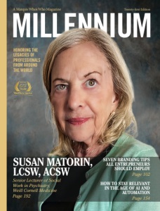 MILLENNIUM BUSINESS LEADERSHIP Chief Executive Officer Erica Lee Chief Marketing Officer Kristine McCarthy Executive Vice President, HR and Organizational Development Deborah A. Morrissey Director of Recruitment Fran Bardio Vice President, Sales and Training Michael Swinarski Senior Sales Manager Nikki Masih Sales Manager Irmela Kastrat Customer Service and Compliancy Director Iris Cannetti EDITORIAL Director, Editorial Services Renée Dutcher-Pryer Director, Print Production John Sartoris Technical Administrator, Editorial Charles Varriale Senior Editor Lisa Diamond Staff Writer Morgan Murphy CREATIVE SERVICES Senior Graphic Designers Henry Monge Carlton Ramsey Design Assistant Mariz Custodio Millennium Magazine is a registered trademark published by Marquis Who’s Who Ventures LLC 350 RXR Plaza, Uniondale, NY 11556 Copyright 2025 © All rights reserved. No part of this publication may be reproduced, stored in a retrieval system, or transmitted in any form or by any means – including, but not limited to, electronic, photocopying, recording or otherwise – or used for any commercial purpose whatsoever without the prior written permission of the publisher and, if the publisher deems necessary, execution of a formal license agreement with the publisher. Manufactured in the United States of America. ISSN: 2577-6991 (Online) ISSN: 2577-7009 (Print)